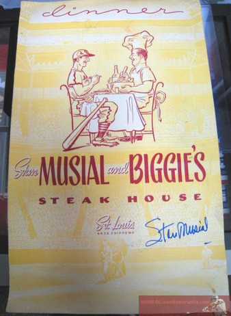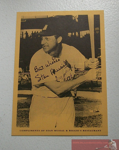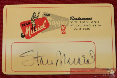 This item is an actual entry card to Stan Musial's restaurant in the 1970's. The restaurant was named 'Stan Musial and Biggies' and was located on Oakland avenue across from the St. Louis Zoo and just down the street from the old Arena (where the St. Louis Blues played). None of those buildings are standing today unfortunately. This item is made of plastic and quite durable. The seller had this personally autographed with a Stan The Man COA Letter.