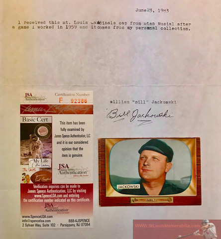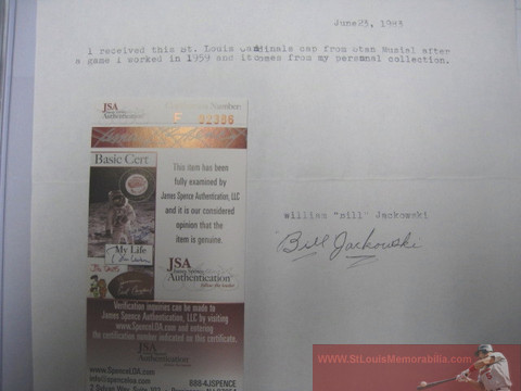 From Bill Jackowskis (Umpire) Collection and Signed By Stan. The letter is signed by Bill Jackowski dated June 23, 1983 and the letter has been authenticated by JSA. Your JSA certification is valid only if accompanied by a matching alphanumeric Basic Cert card or our proprietary watermarked and notarized Letter of Authenticity. Certificate Number: F92386 Signer: Bill Jackowski Description: TLS. William Anthony Jackowski (September 27, 1914 - July 29, 1996) was a professional baseball umpire who worked in the National League from 1952 to 1968. Jackowski umpired 2,517 major league games in his 17 year career. He umpired in three World Series (1958, 1960 and 1966) and three All-Star Games (1956, 1959 and 1963).