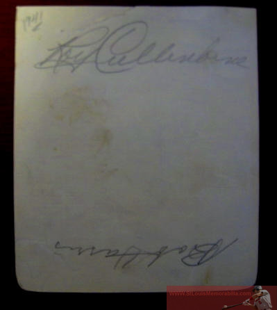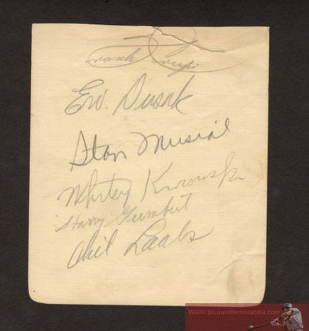 The Seller I received this from stated the following:Stan Musial was a late season call-up for the St. Louis Cardinals at the end of 1941 and this sheet of autographs from 1941 includes "Stan the Man" During one of the games he was involved in during late 1941! The autographs on the sheet are all St. Louis Cardinals and Browns players and include a couple late 1941 call ups and also a few guys who were out of baseball after 1942 so this is 100% a 1941 signature of Stan the Man. I have NEVER seen another signature of Musial that absolutely dates to his Rookie Year! Dated on the back as being from 1941. Two signatures on the back not shown are Roy Cullenbine and Bob Harris (both 1941 Browns players). Small rip at the top which affects the Frank Creepy Crespi autograph but is nowhere near the Musial! The other autographs from the 1941 team are Erv Dusak, Whitey Kurowski, Harry Gumbert, and from the 1941 St. Louis Browns is Chet Laabs. Stan Musials first game with the Cardinals was on September 19, 1941 at the age of 20. Cullenbine, Harris, and Laabs played for the 1941 St. Louis Browns. Crespi, Dusak, Kurowski, and Gumbert played for the 1941 St. Louis Cardinals. A roster of the 1941 St. Louis Cardianals can be seen at http://www.baseball-almanac.com/teamstats/roster.php?y=1941&t=SLN . JSA Authenticated Certificate Number: X56060 Signer: 1941 St Louis Cardinals - / St Louis Browns Field: Baseball Description: Multi Signed Sheet Manufacturer: Not Visible Size: 4 1/2" x 5 1/8" V Number Of Signatures: 8 Location: Front / Back Writing Implement: Graphite Pencil Color: Grey Notes: HOF(s): S.Musial KEYS(s): F. Crespi/ E. Dusak/ W. Kurowski/ H. Gumbert/ C. Laabs/ R. Cullenbine/ B. Harris